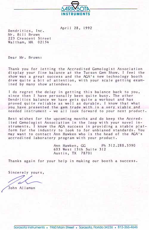 John Allaman who founded Sarasota Instruments had a fascinating little digital wizardry for measuring refractive index (he called it "reflective index") called the Jemeter. We once swapped a Gemscale for one of his meters. He wasn't really a Beta Site, more like a friend in the business. He smartened up in life somewhere in the mid-90's, and switched to selling kayaks! By 2002, he had found yet a new career. In his words, "Yes I have moved in to Real Estate, no longer burdened by the weight of minerals, the vision of optics, the lugging out and putting back of Kayaks every day. Now I am a land trader selling swamp land in Florida." Go, John. The very best of luck to you.