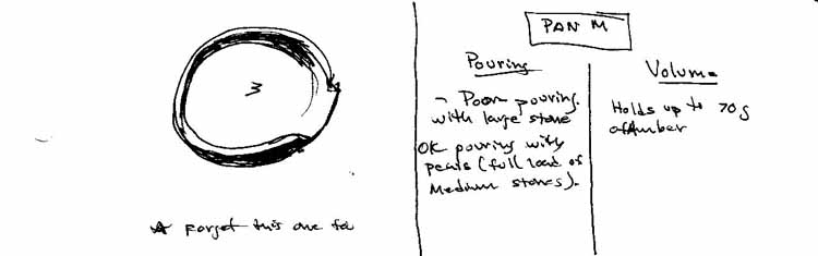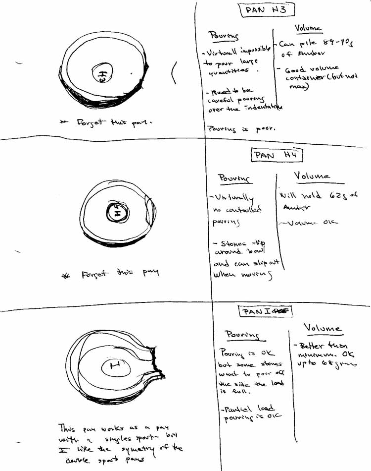 PAN A/ is a promising pan. It holds 100g of amber piled up carefully. It will hold every other material nicely and easily. It needs a weight locating area. The angle of the slope of the bowl is a bit steep as an excessive angle is required to get the last stones out at the end of a pour. Internal contouring as done in pan E and Pan F would help. Also I would like to see the slope of the smaller spout eased from this to something like this. An edge around the rim would make it much easier to pick up from the scale.