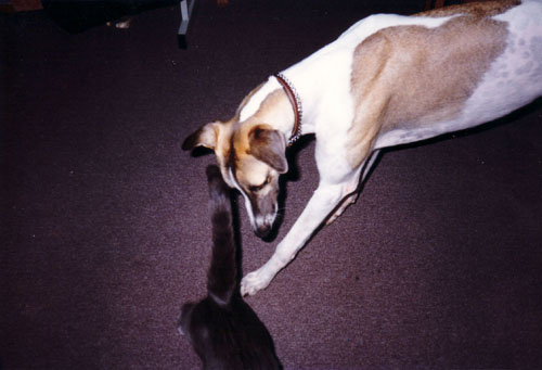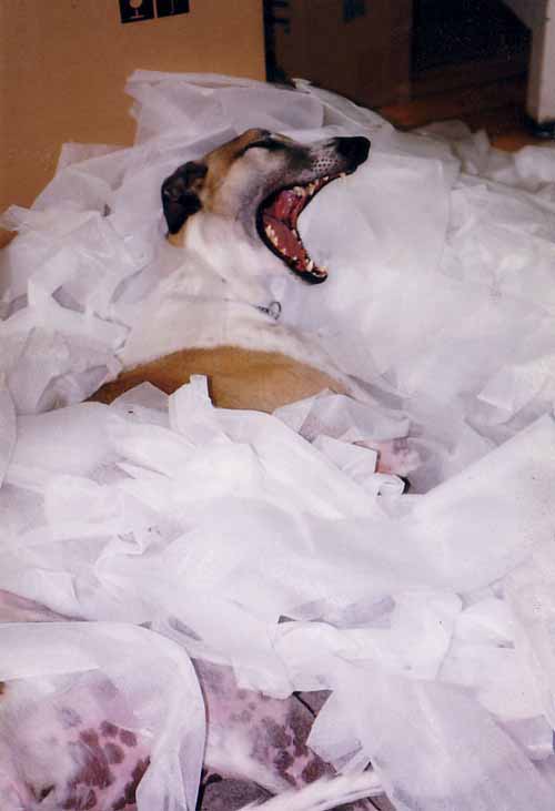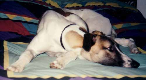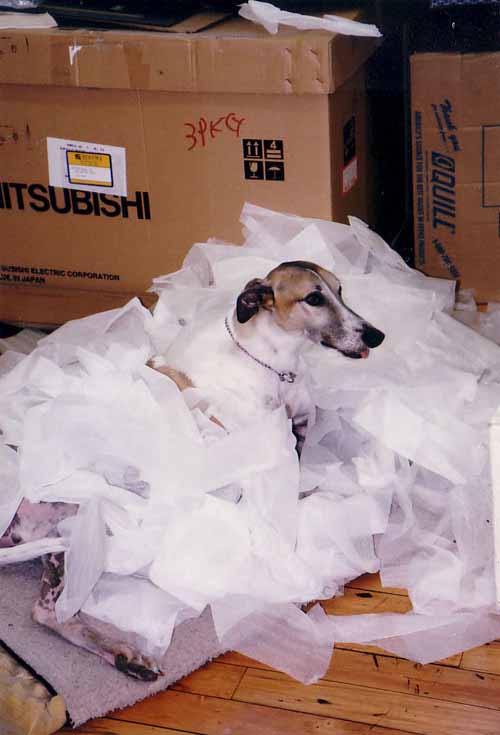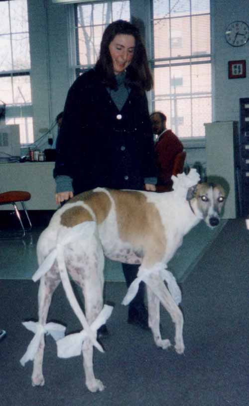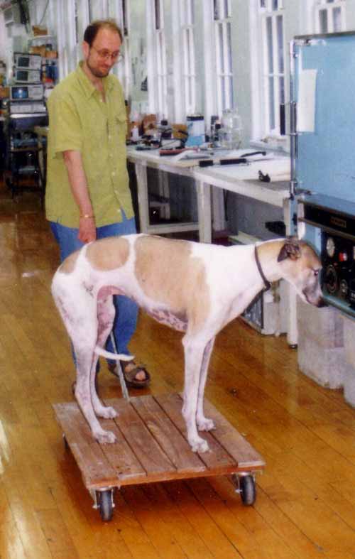 Happy's life pretty much paralleled that of Dendritics as a production company.  He was born May 24, 1992.  Joined us in September 92 as a rare greyhound puppy aged only 15 weeks.  Celebrated his 10th birthday in May 2002 and died July 28, 2002.  He was a major force in our interviewing process, passing judgment on one and all without concern for political correctness.  You had to at least think he was OK, or how could you survive?  Irina and her daughter were initially terrified of dogs, but he won them over with his sweet side.
