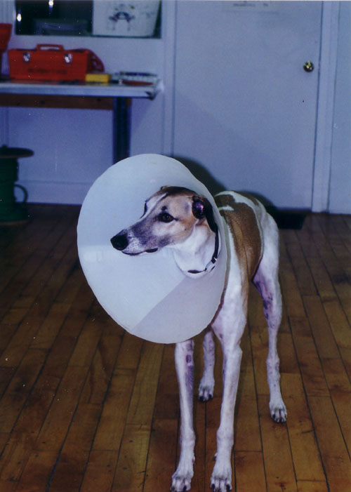 Greyhounds all have thin skin, so it was not surprising that there were a couple of periods when Happy was adorned with so-called Elizabethan Collars.  He did his very best to ignore them and look regal.  It was not easy.  We would tell people he was wearing a radar dish and scanning for booty.