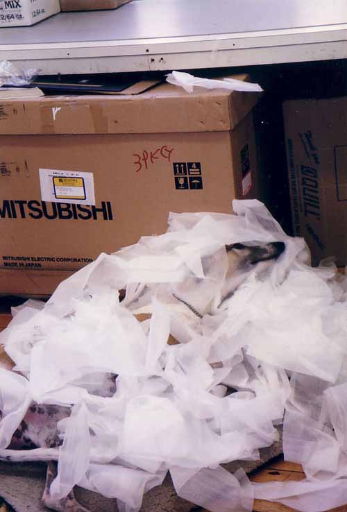 The following 3 are a cute series of Happy engulfed in the special antistatic foam we used for packaging draftshields.  In the background are the boxes which Dave the Robot came in.