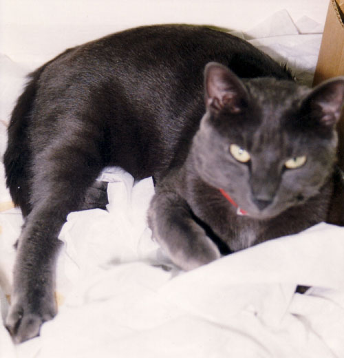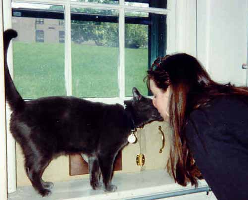 Here are Squirkel and Marian going at it. Behind them is the custom cat door we created to allow free cat access to the front courtyard visible through the window.